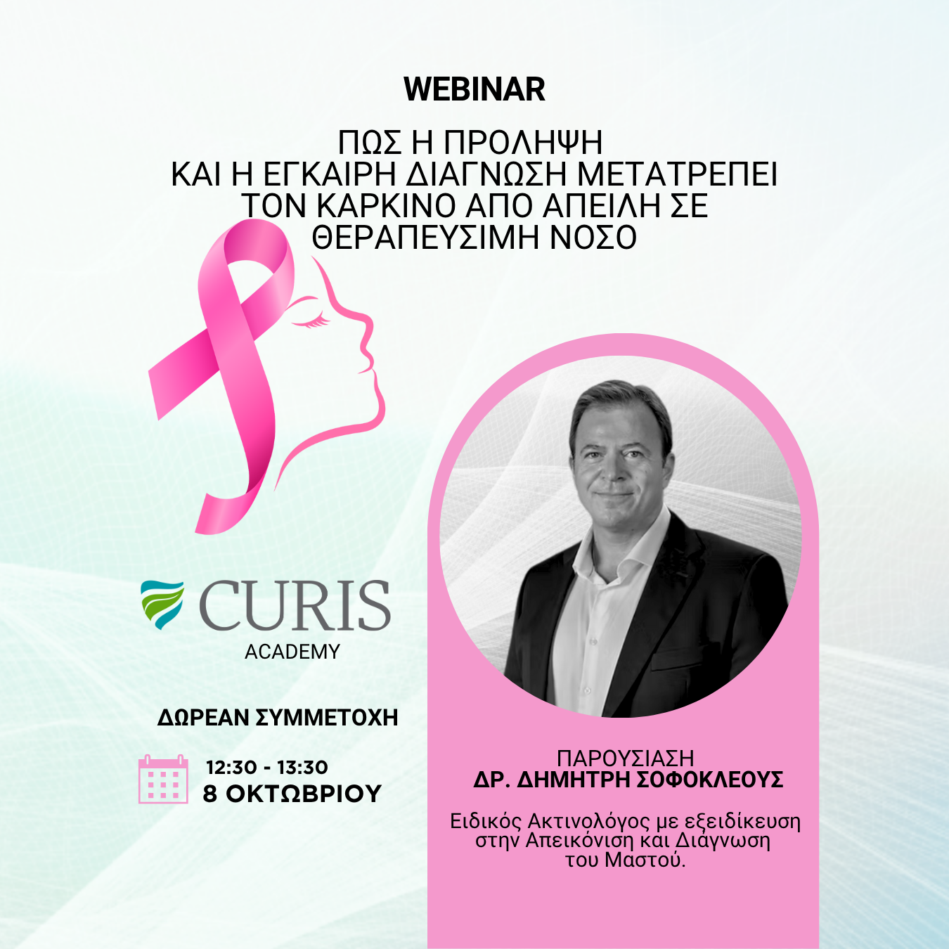 Αυτόν τον Οκτώβριο, Μήνα Ευαισθητοποίησης για τον Καρκίνο του Μαστού, το Curis Academy σας προσκαλεί σε έναν ξεχωριστό κύκλο webinars και σεμιναρίων με κορυφαίους ειδικούς γιατρούς και επαγγελματίες στον τομέα της γυναικείας υγείας.
