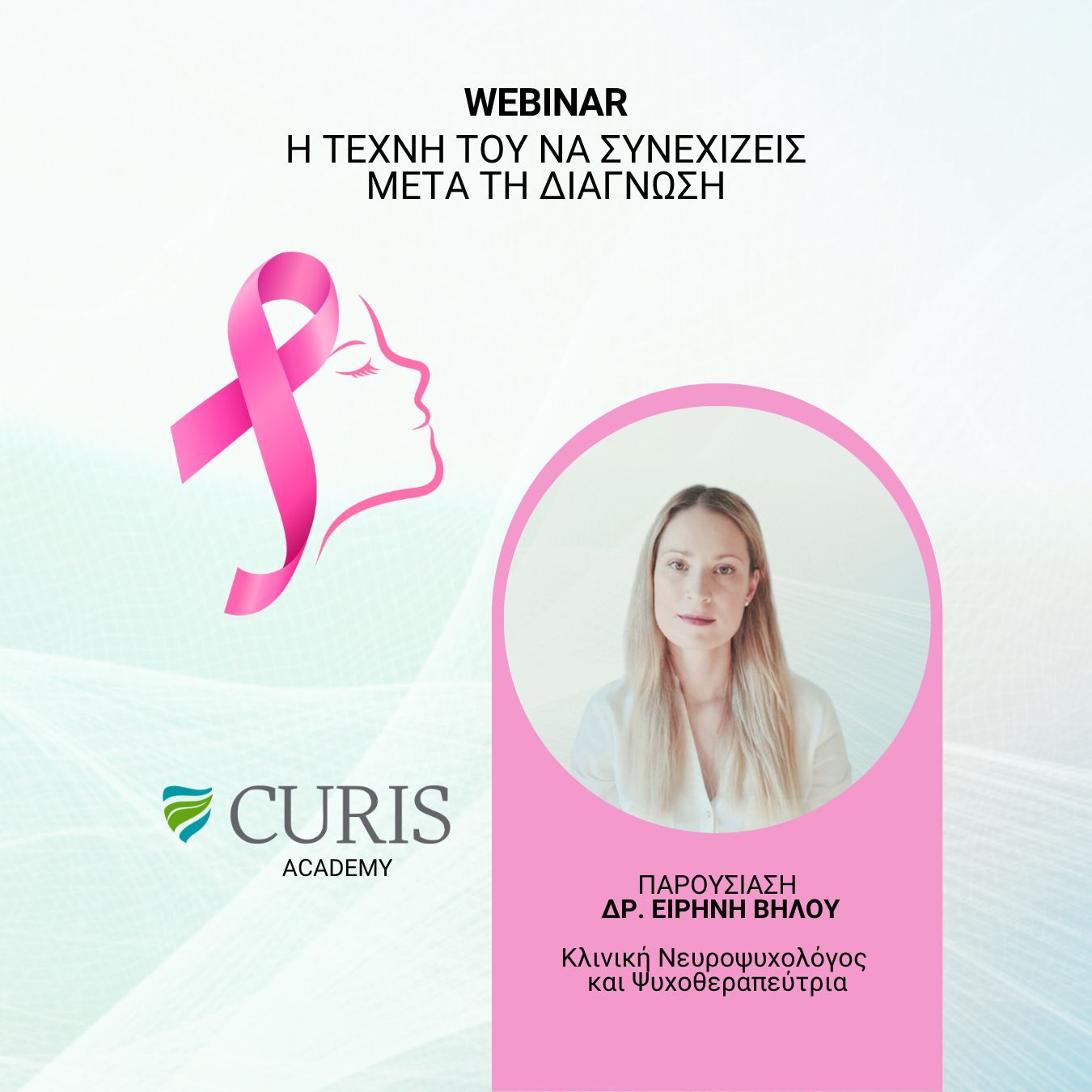 Στα πλαίσια του Μήνα Ευαισθητοποίησης για τον Καρκίνο του Μαστού, το Curis Academy διοργάνωσε το webinar, " Η Τέχνη του να Συνεχίζεις μετά τη Διάγνωση", που πραγματοποιήθηκε στις 15 Οκτωβρίου.